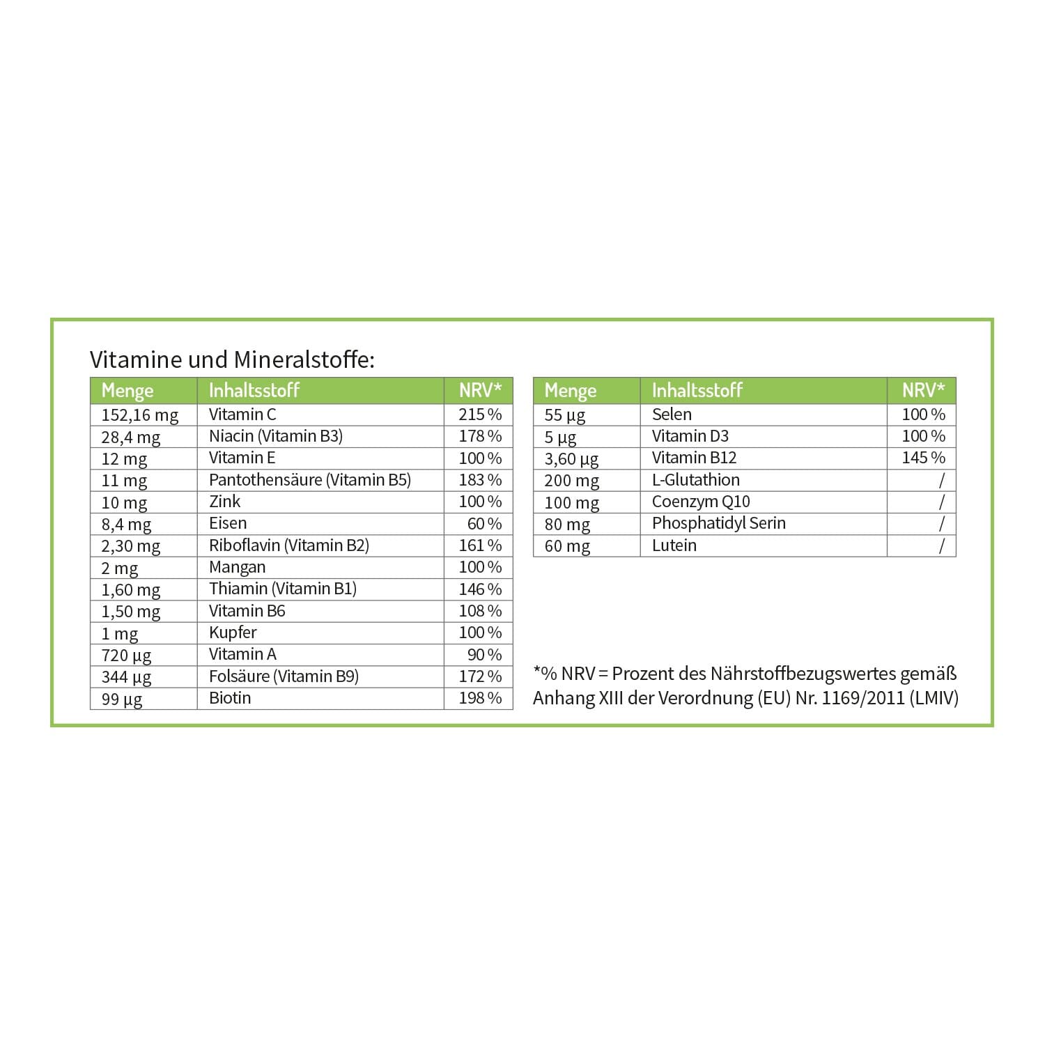 Vitamine und Mineralstoffe pro Tagesdosis (Prozentangaben gemäß NRV*):