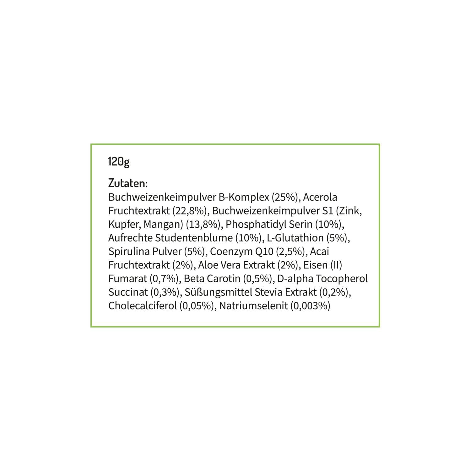 Für unser Produkt verwenden wir Buchweizenkeimpulver. Es enthält mehrere Vitamine der B-Komplex Gruppe sowie Mineralstoffe. Darüber hinaus ist reiner Buchweizen frei von Gluten.